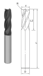 | 4 Flutes Corner Radius End Mill | Item Code | Flute Diameter | R | Flute Length | Overall Length | Shank Diameter |