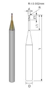 | Micro Diameter Miniature 2 Flutes Rib Corner Radius End Mill | Item Code | Outside Diameter | R | Flute Length | Effective Length | Overall Length | Shank Diameter |