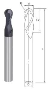 | Long Shank Ball Nose End Mill/2 Flutes | Item Code | Radius | Flute Length | Overall Length | Shank Diameter |