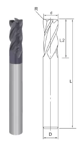 | Long Shank Corner Radius End Mill/4 Flutes | Item Code | Flute Diameter | R | Flute Length | Overall Length | Shank Diameter |