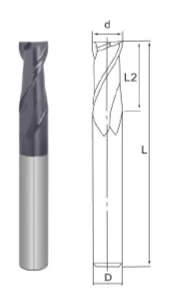 | 2 Flutes Square End Mill | Item Code | Outside Diameter | Flute Length | Overall Length | Shank Diameter |