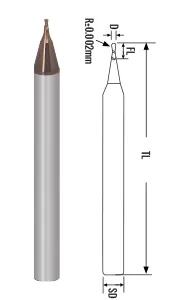 Micro Diameter Miniature 2 Flutes Ball Nose End MillItem CodeOutside Diameter(D)Flute Length(FL)Overall Length(TL)Shank Diameter(SD)