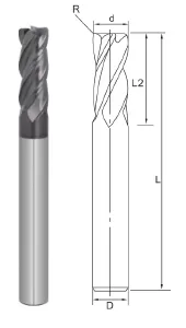 | Long Shank Unequal Spiral Corner Radius End Mill/4 Flutes | Item Code | Flute Diameter | R | Flute Length | Overall Length | Shank Diameter |